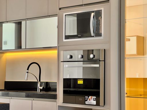 Cozinha planejada completa (geladeira, forno, micro-ondas, cooktop e coifa).