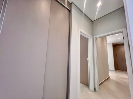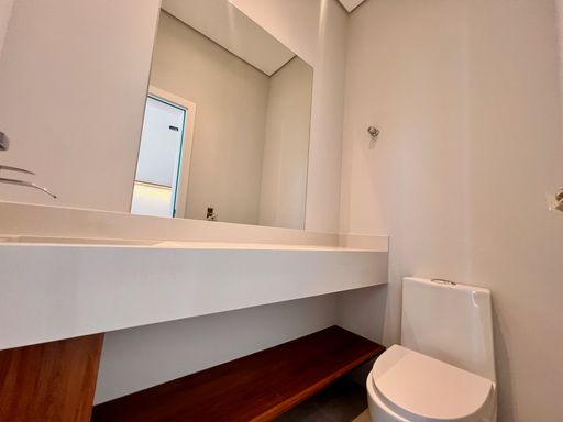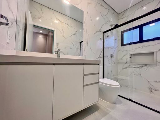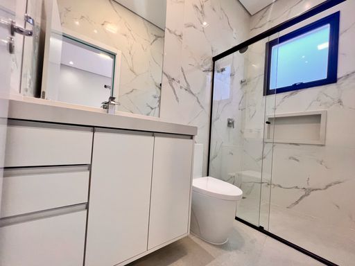3 suítes com armários planejados; banheiros com box e espelhos.